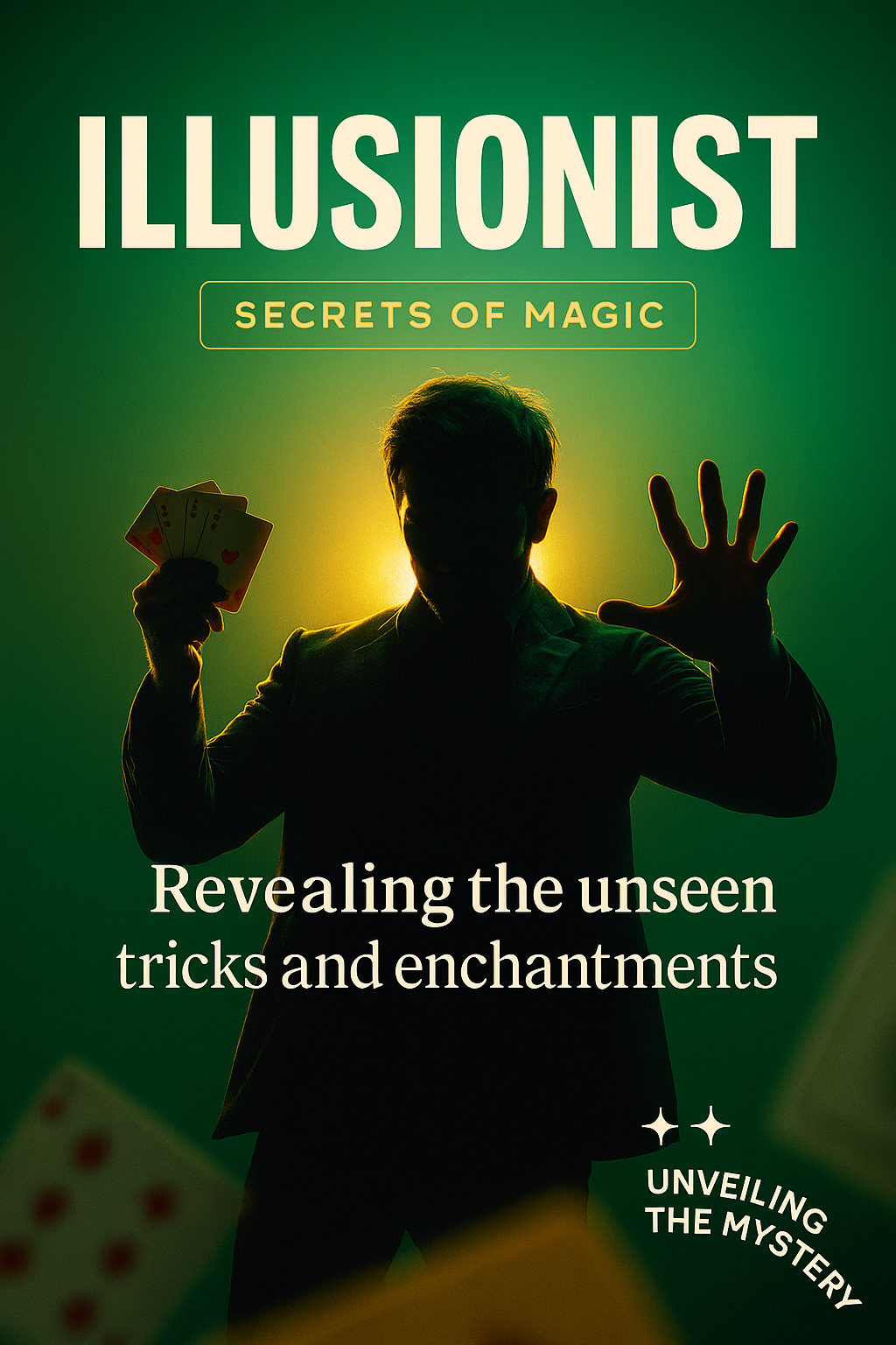 A captivating silhouette of an illusionist in motion, showcasing a dramatic pose with cards in hand. The vibrant green background enhances the mystique of magic.
