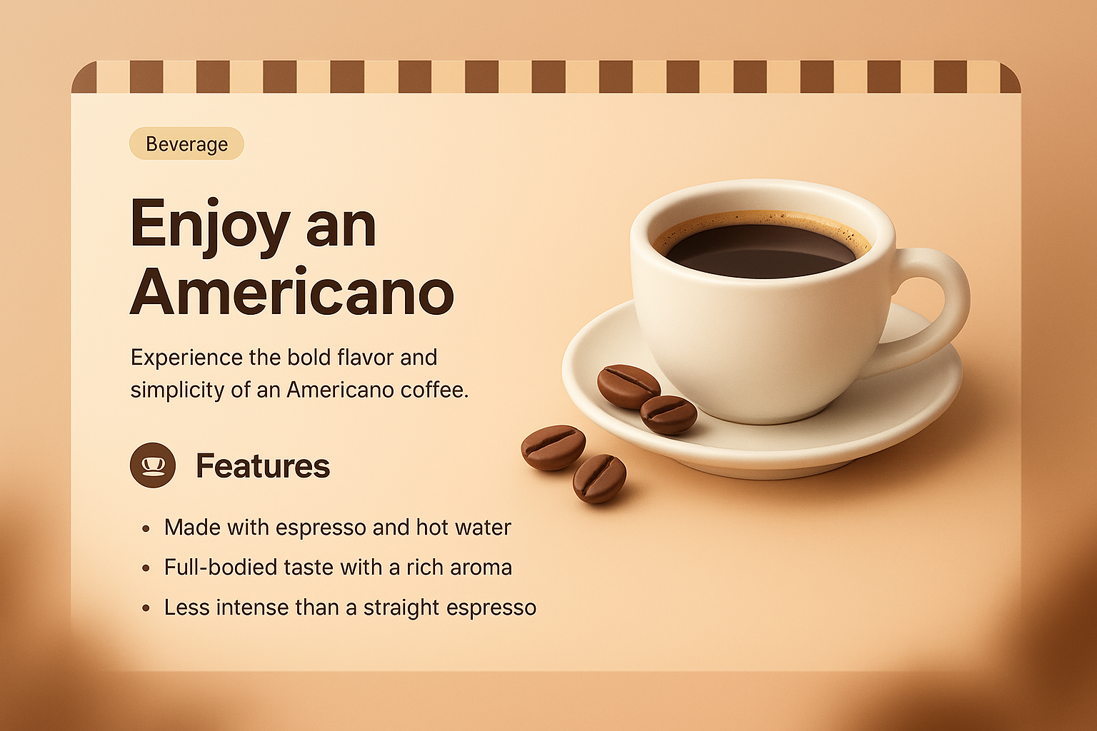 A visually appealing landing page design featuring a 3D illustration of an Americano coffee cup with detailed features highlighted. Includes a gradient background and engaging layout.