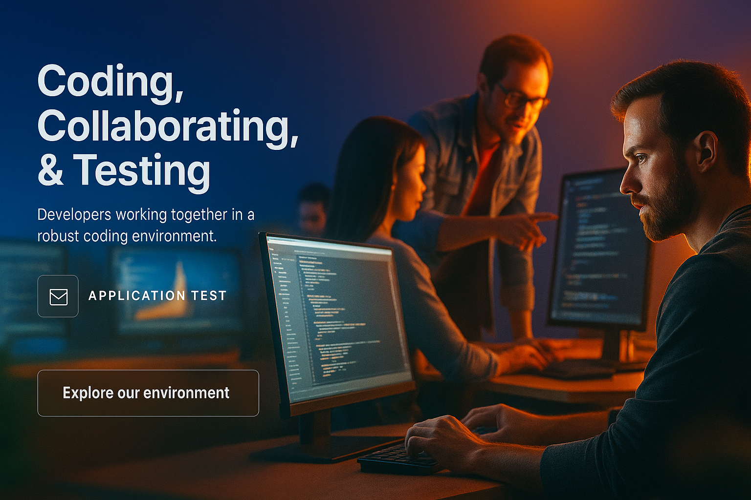 /Collection: /by davooda/Type: PNG/A vibrant scene of software developers collaborating in a modern workspace, coding and testing applications with screens aglow, emphasizing teamwork and innovation.