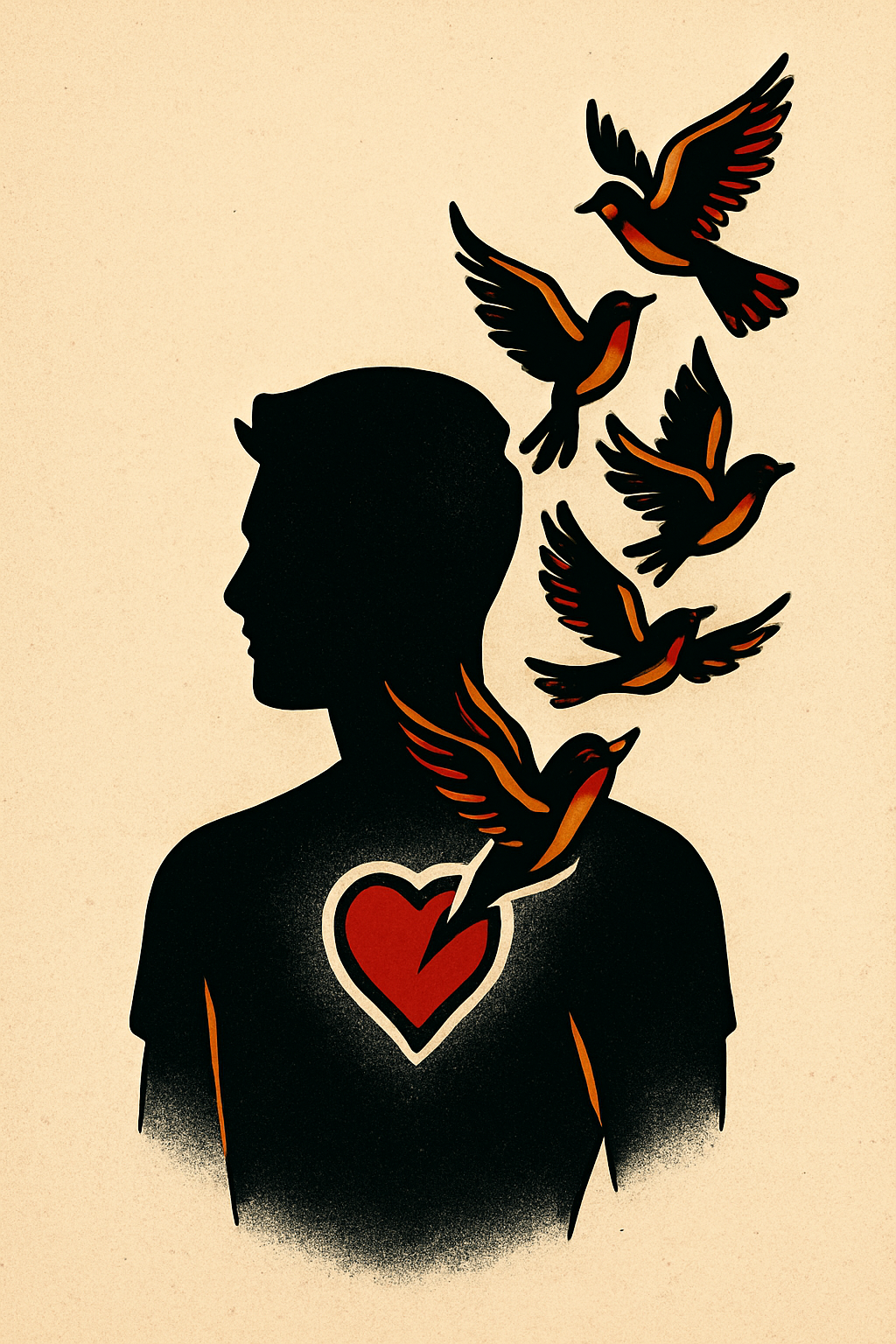 Silhouette of a Heart with Birds Emerging - Tattoo Design