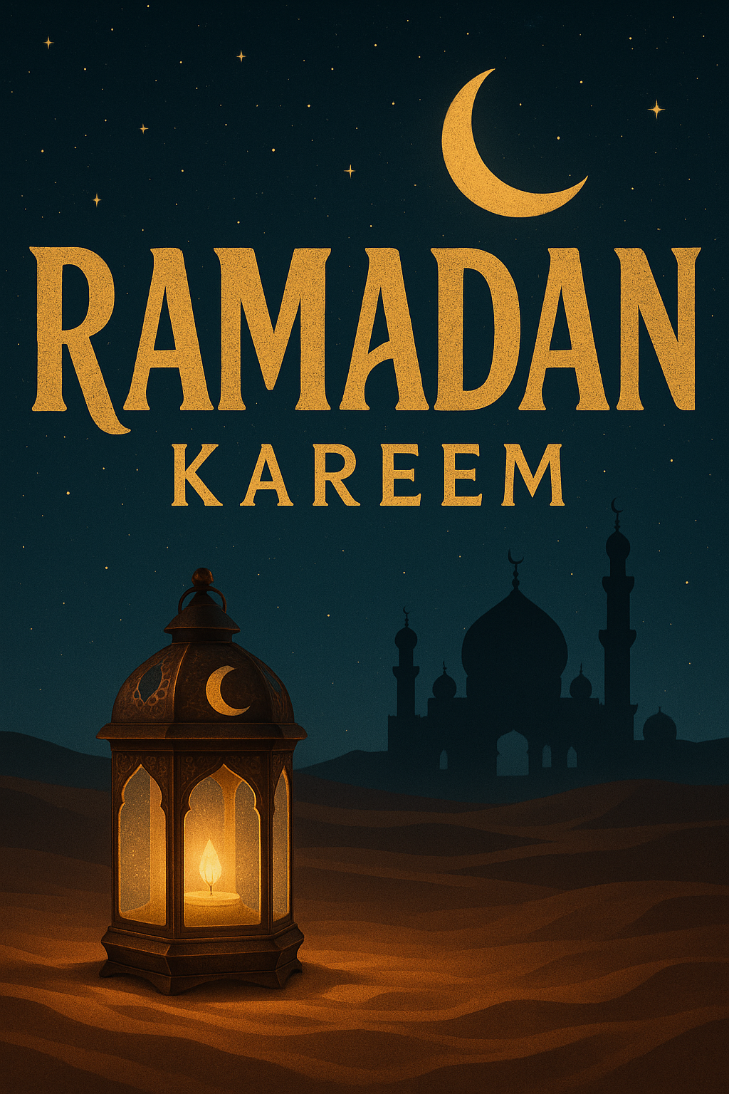 /Collection: /by davooda/Type: PNG/Beautiful greeting card design for Ramadan featuring a lantern and mosque silhouette against a starry night sky. Ideal for sharing festive wishes during the holy month.