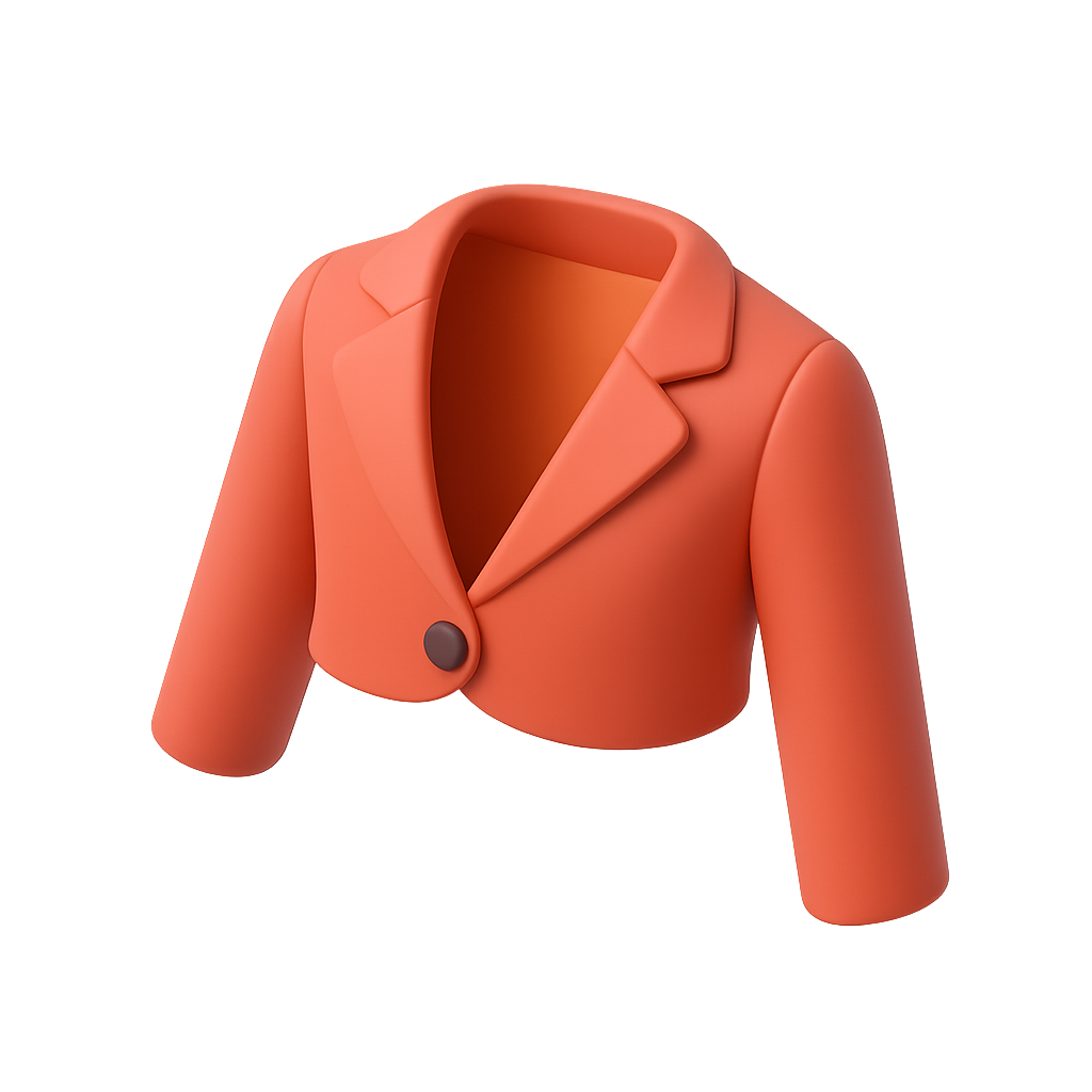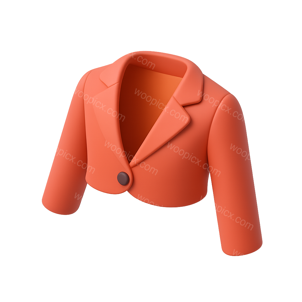 A vibrant 3D representation of a bolero jacket in an isometric view. The jacket features a smooth, orange texture with a classic collar and button, set against a soft gradient background.