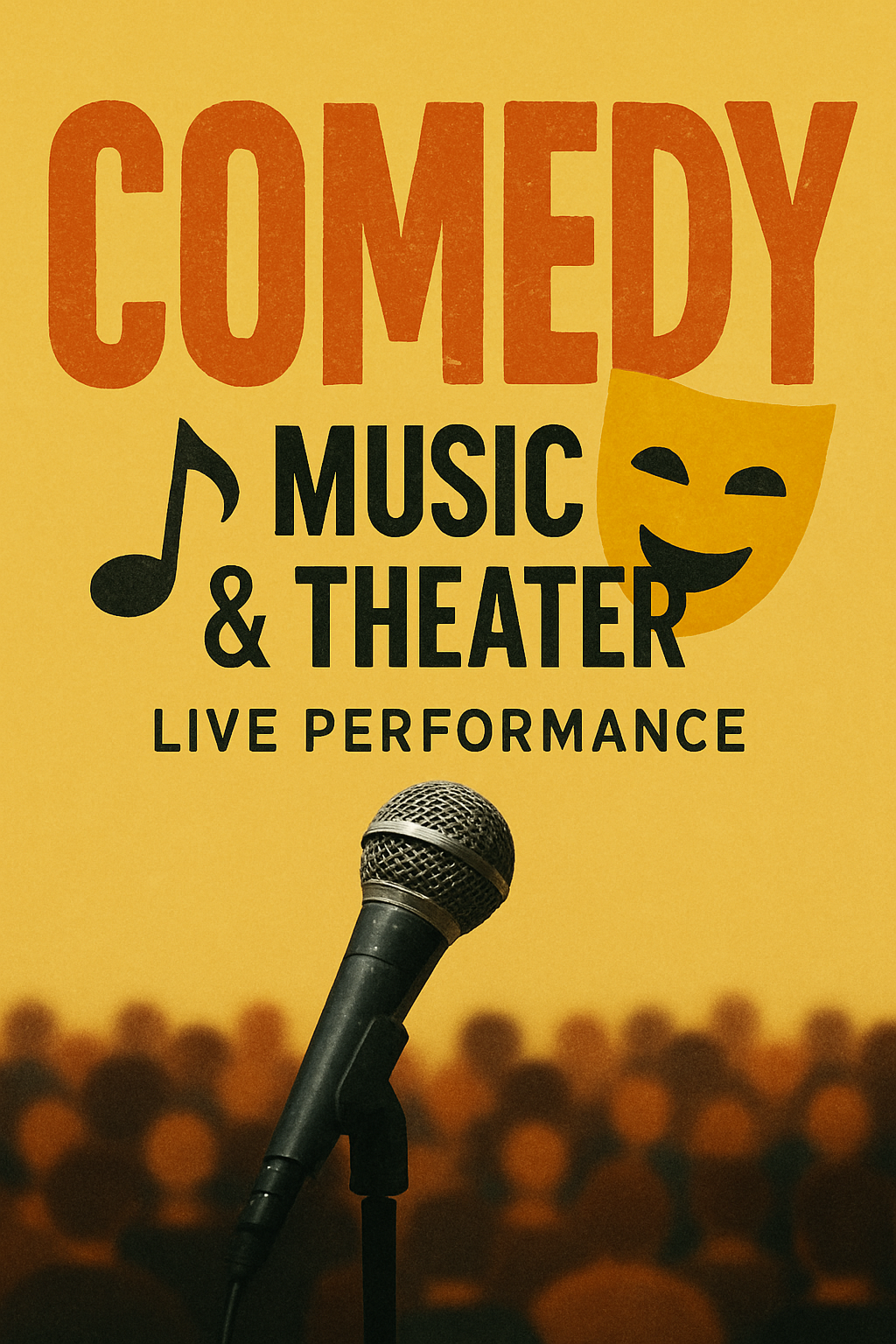 Vibrant promotional graphic for a live performance featuring comedy, music, and theater. The design uses bold typography and playful icons to attract an audience.