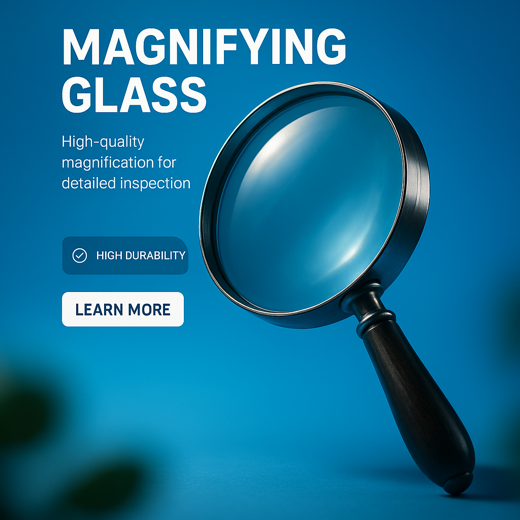 /Collection: /by davooda/Type: PNG/A realistic magnifying glass set against a vibrant blue background, featuring high-quality text elements for durability and a call-to-action button. The design emphasizes clarity and depth.