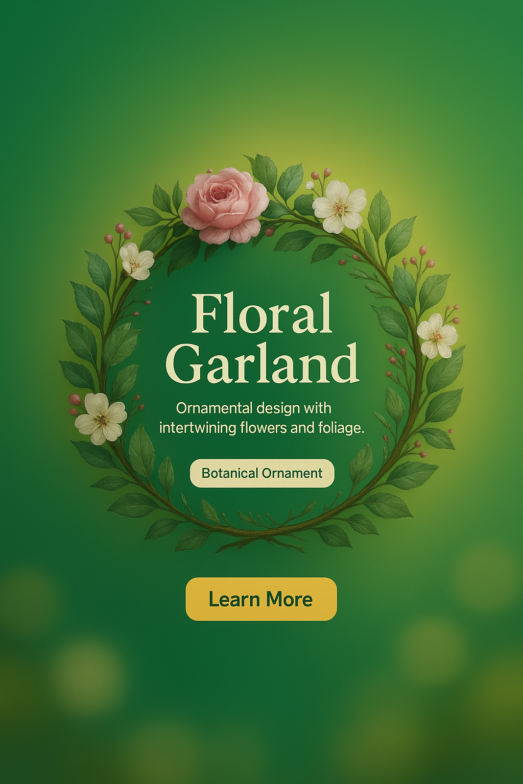 /Collection: /by davooda/Type: PNG/This image features a botanical ornament with a floral garland design. It combines flowers and foliage in a vibrant green background, suitable for promotional or decorative use.