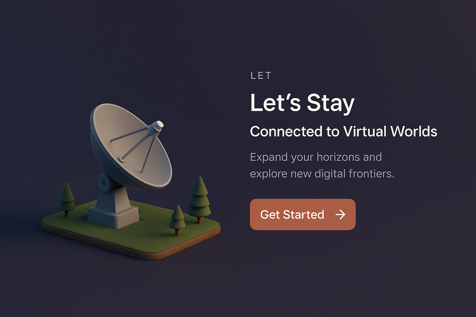 A zoomed-out 3D scene featuring a satellite dish, surrounded by simple trees, set against a dark gradient background. Text elements include a title and a call-to-action button.