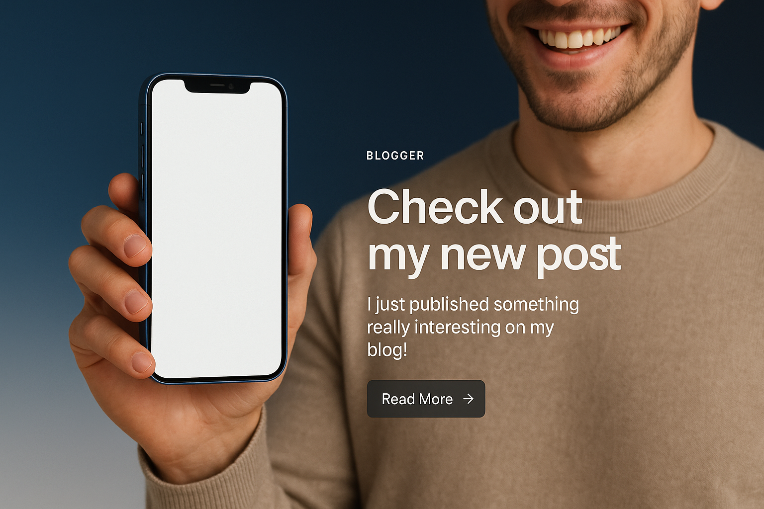 Engaging Blogger with Smartphone Displaying New Post Announcement