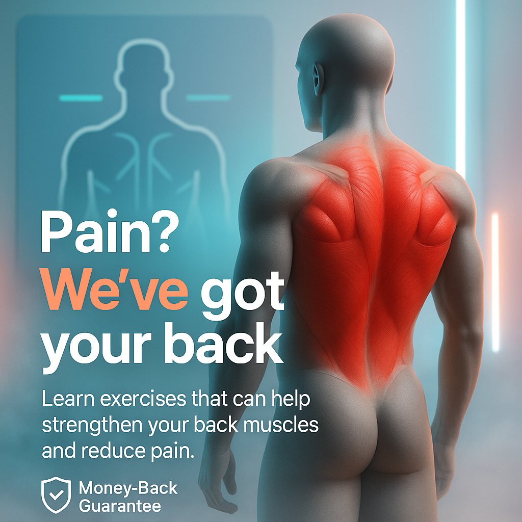 /Collection: /by davooda/Type: PNG/Engaging promotional graphic highlighting exercises for back pain relief, featuring a stylized human figure with visible muscle anatomy and modern design elements. Ideal for health and fitness marketing.
