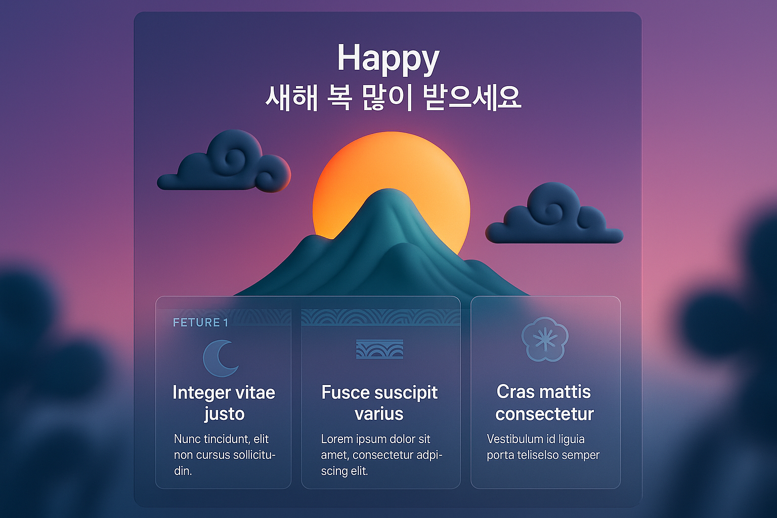 A vibrant 3D illustration representing the Lunar New Year with a sunrise, featuring layered visuals, text in multiple languages, and a cohesive design aesthetic.