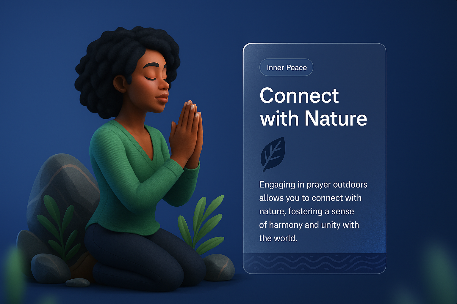 /Collection: /by davooda/Type: PNG/A serene 3D illustration of an African American woman praying outdoors, surrounded by rocks and greenery. The scene conveys inner peace and harmony with nature.