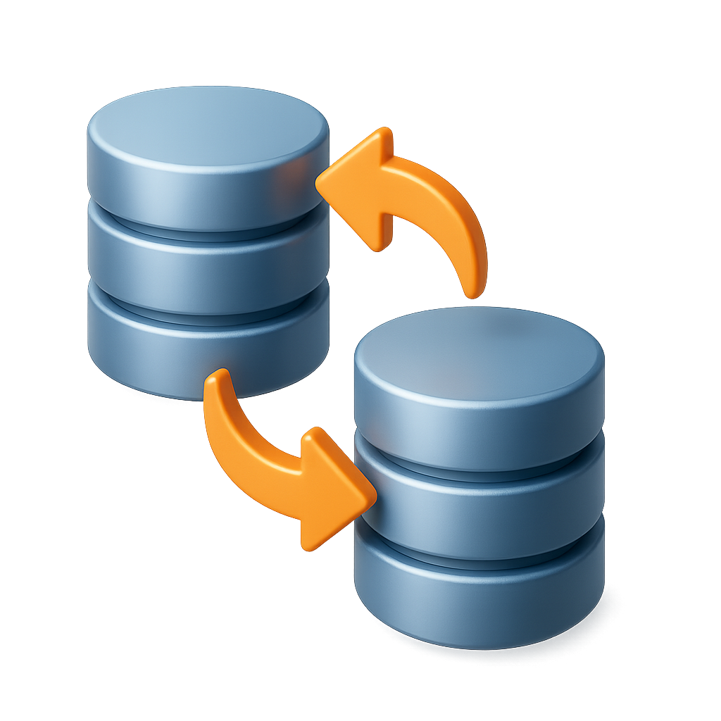/Collection: /by davooda/Type: PNG/A visually appealing 3D icon depicting two cylindrical databases with arrows indicating data exchange. The design features a transparent background and a three-quarter isometric view.