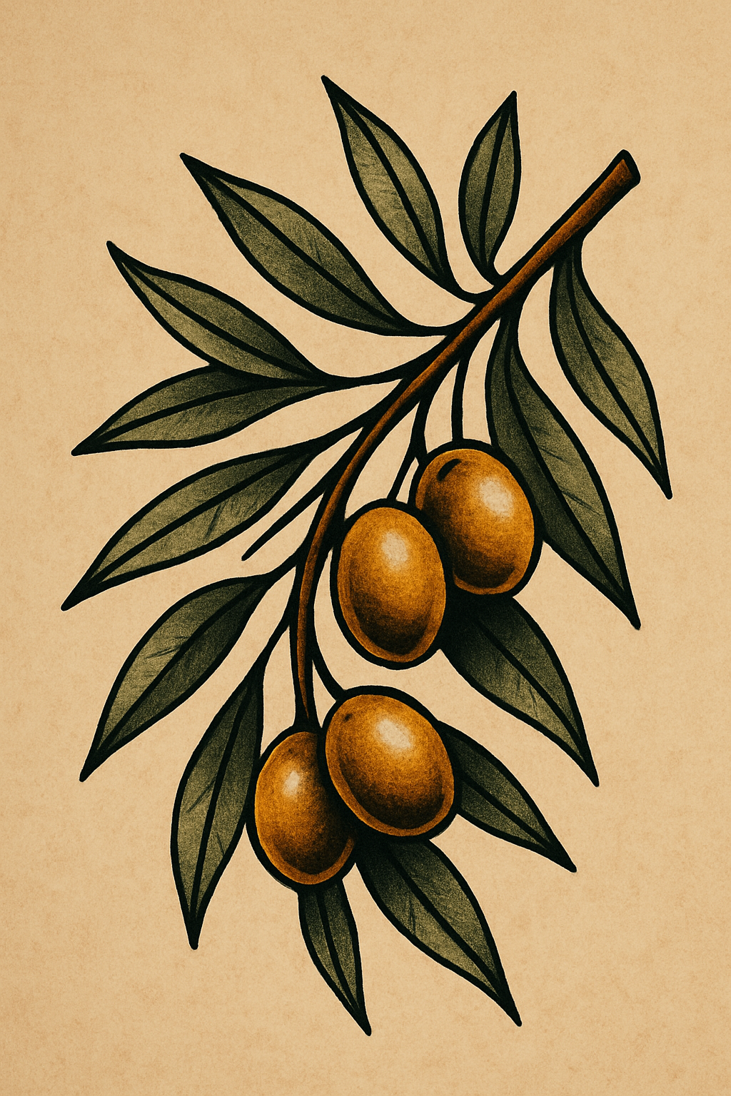 This image features a detailed botanical illustration of an olive branch with fruit. The vintage style and earthy tones suggest a focus on nature and organic themes, suitable for culinary or artisanal themes.