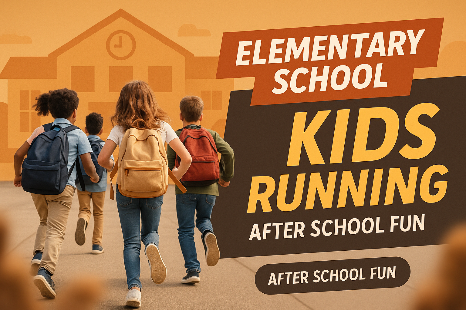 Vibrant graphic depicting children running after school, capturing the excitement of after-school activities. Ideal for promoting school events or programs.