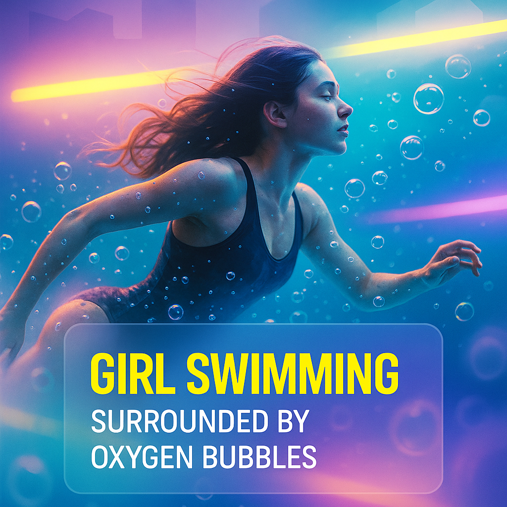 Vibrant underwater image featuring a girl swimming amidst oxygen bubbles, showcasing a modern and energetic visual style ideal for promotional or artistic use.
