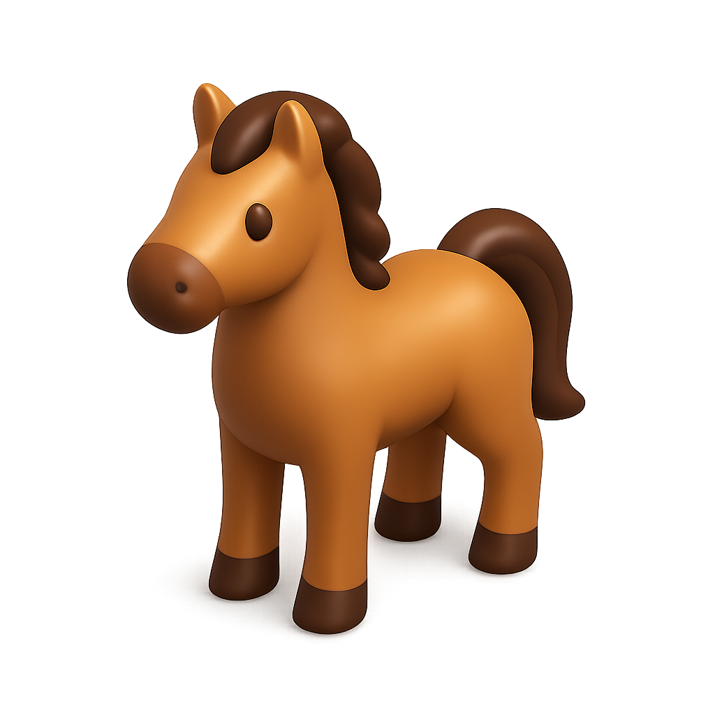 A charming 3D icon of a stallion horse, presented in a three-quarter view with a glossy finish. The horse features a brown body, darker hooves, and a playful expression, set against a soft gradient background.
