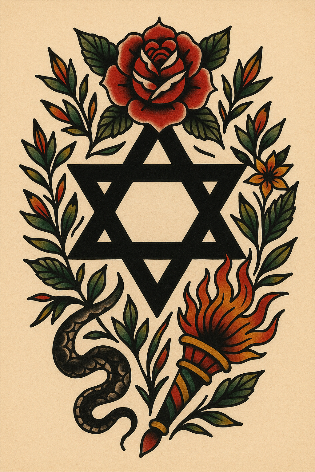 A colorful tattoo design showcasing a Star of David surrounded by roses and other floral motifs. Ideal for body art enthusiasts and cultural symbolism.