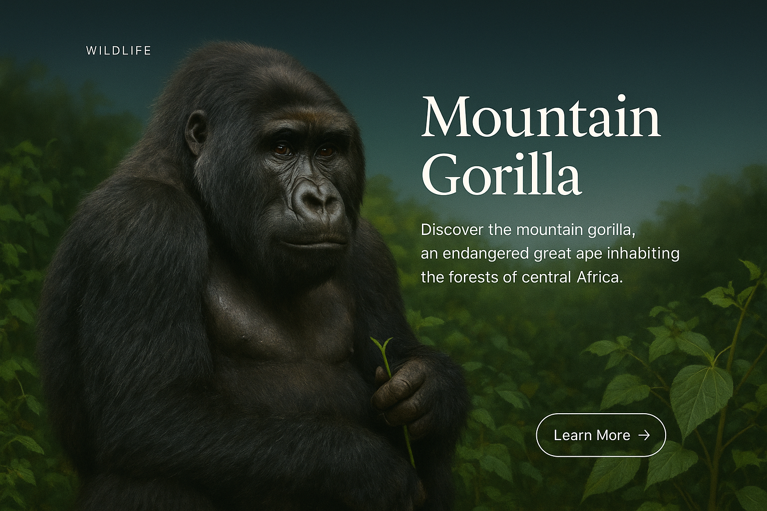 A modern web interface showcases a mountain gorilla with a dark gradient background. It includes a headline, a brief description, and a call-to-action button.