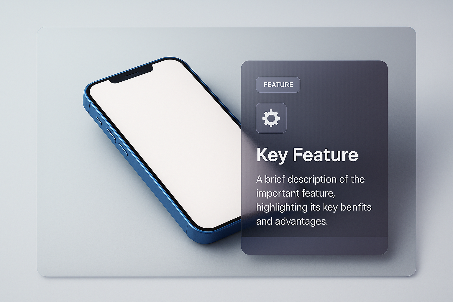 A sleek blue smartphone is displayed at a 45-degree angle on a minimalist surface. An informative overlay highlights key features in a visually appealing way.