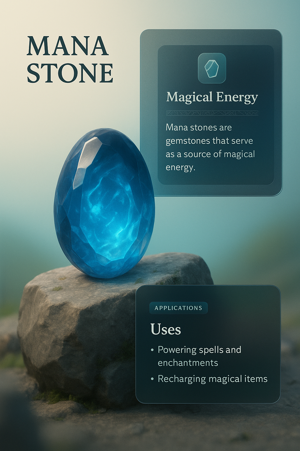 /Collection: /by davooda/Type: PNG/A 3D illustration of a blue mana stone sitting on a rock, with integrated text blocks describing its magical properties and applications. The design features a smooth gradient background.