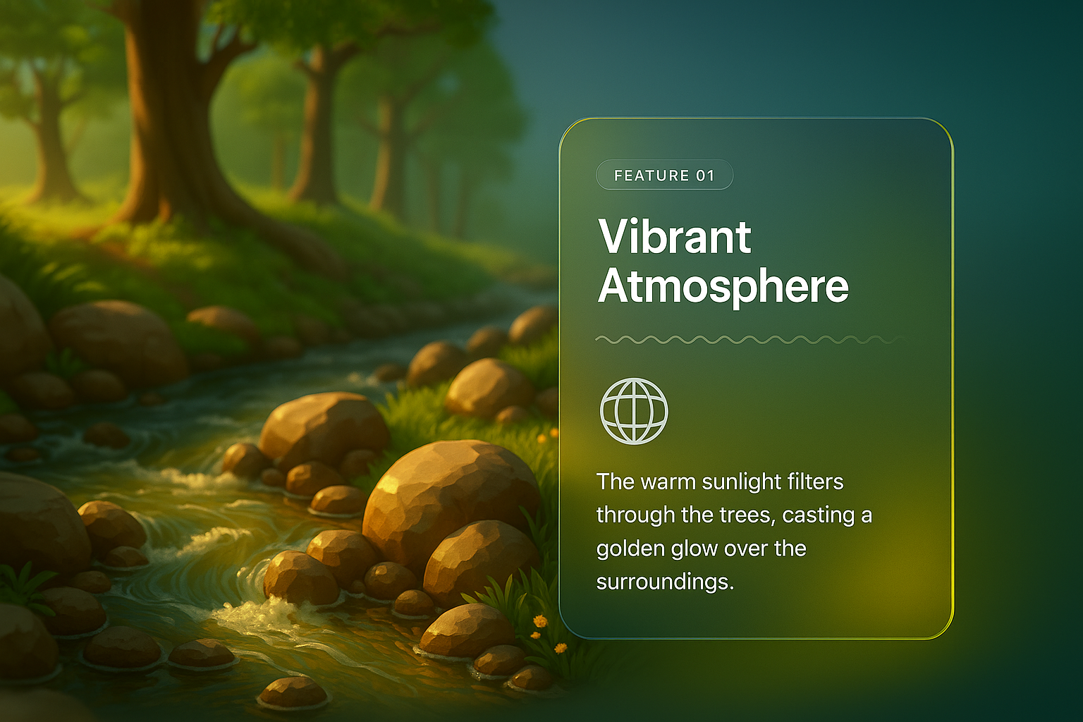 A tranquil forest creek flows through lush greenery, with warm sunlight filtering through the trees, creating a serene and vibrant atmosphere. Smooth stones line the water’s edge.