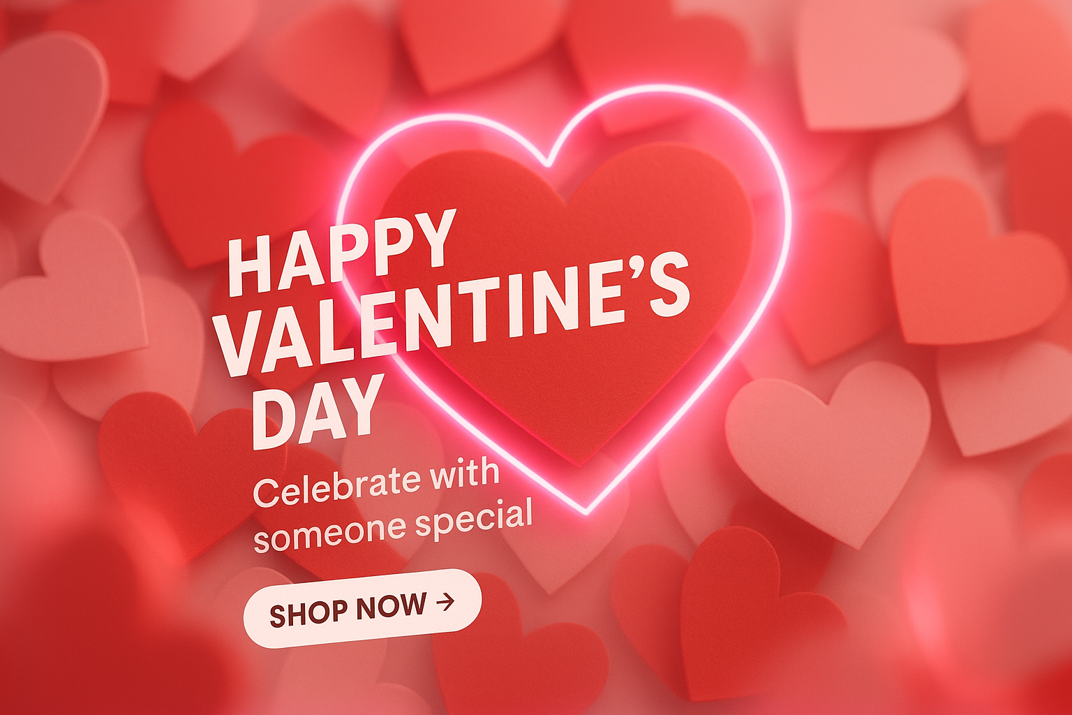 Vibrant Valentine's Day promotional banner featuring a heart motif with neon accents, perfect for e-commerce or event marketing targeting couples.