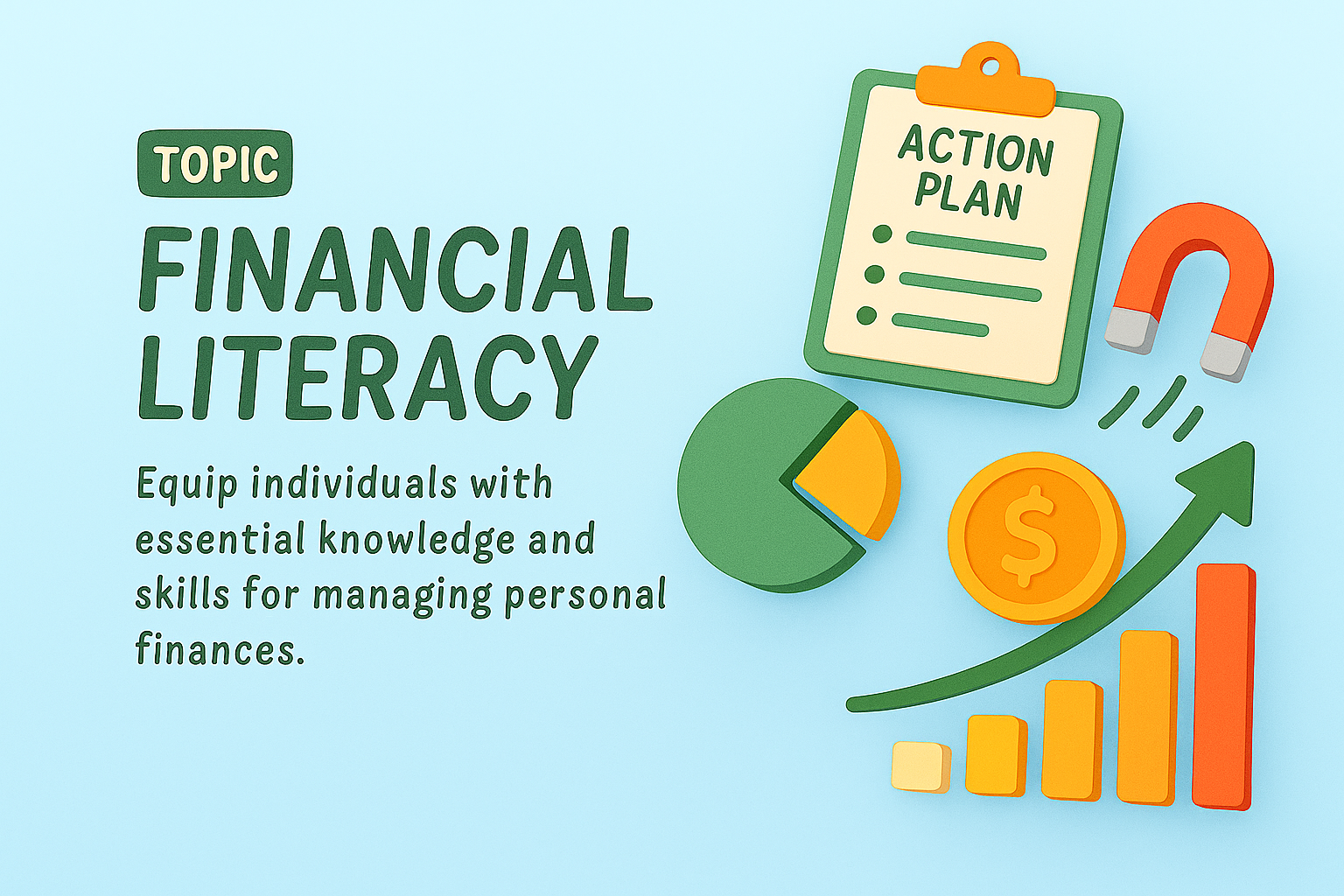 /Collection: /by davooda/Type: PNG/A vibrant educational graphic illustrating financial literacy concepts, featuring icons like a chart, dollar coin, and action plan. Ideal for financial education materials.