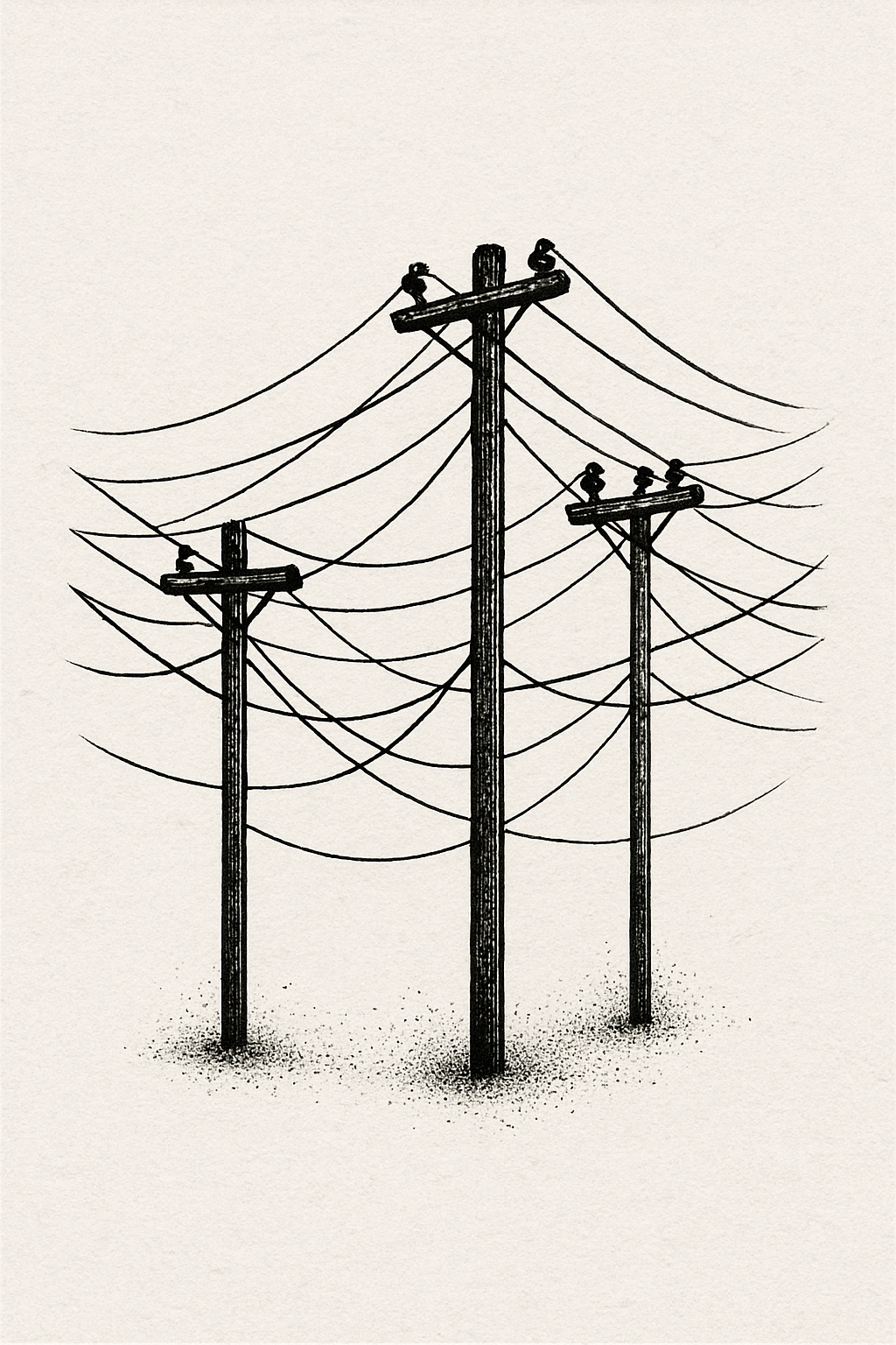 A minimalistic black and white illustration depicting utility poles with birds perched on wires. The style is artistic and abstract, suitable for design or environmental themes.