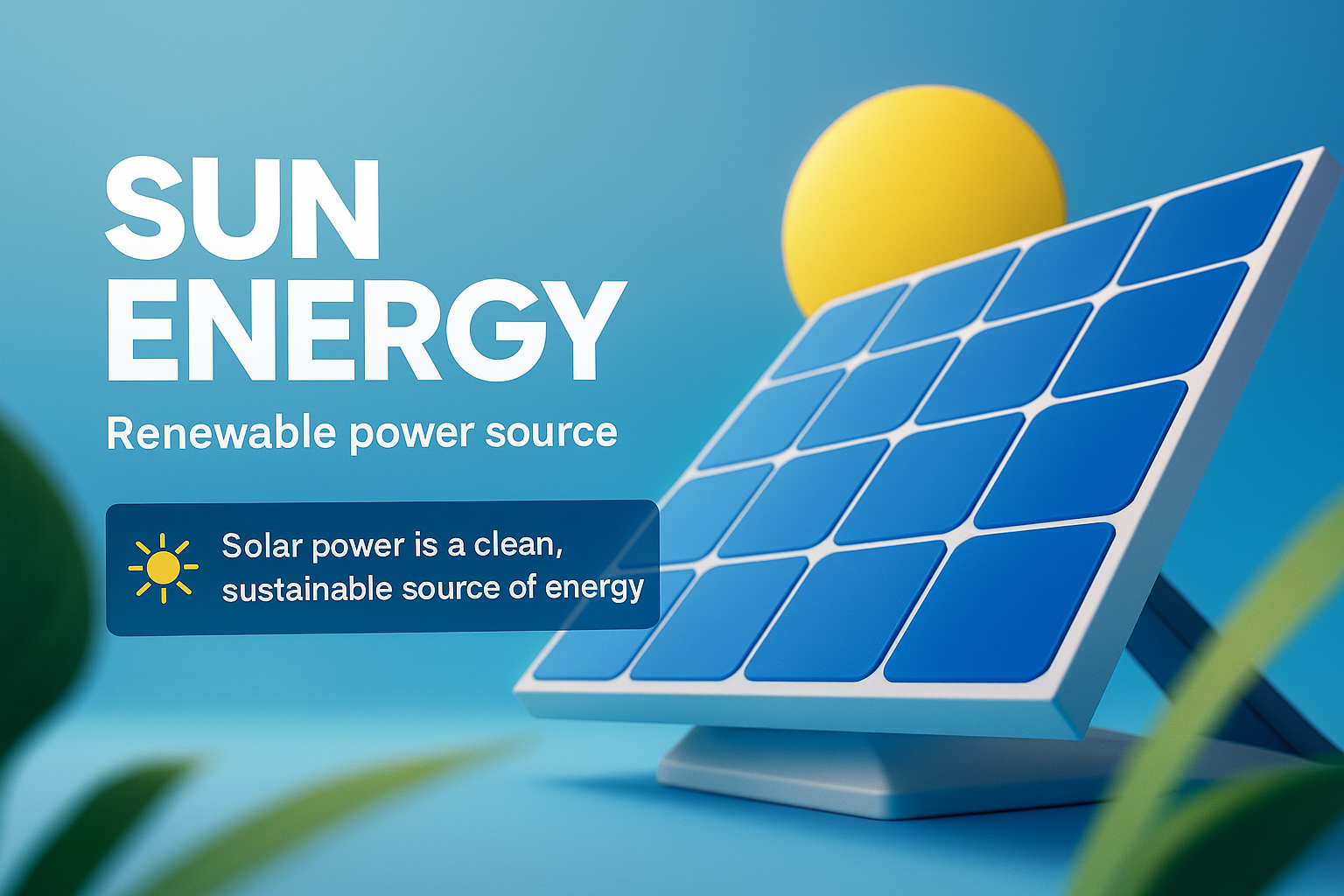 A visually appealing 3D illustration showcasing solar energy with a blue solar panel, a sun icon, and a clean, gradient background. The design emphasizes sustainability.