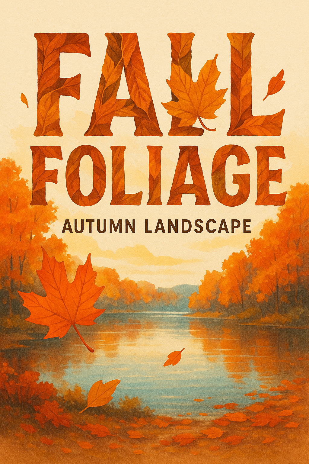 /Collection: /by davooda/Type: PNG/Vibrant autumn landscape illustration showcasing fall foliage with warm colors and a serene water reflection, ideal for seasonal promotions and nature-themed content.