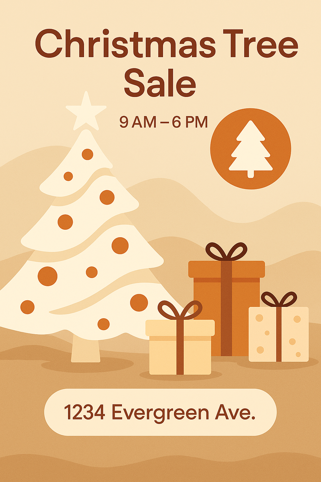 Festive promotional graphic featuring a Christmas tree and gift boxes, ideal for advertising a seasonal sale. The warm color palette and simple design appeal to holiday shoppers.