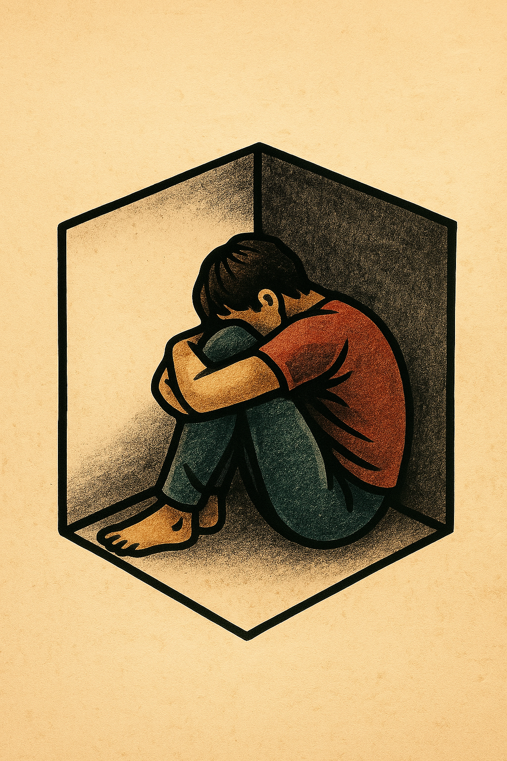 /Collection: /by davooda/Type: PNG/A tattoo design depicting a person sitting in a corner, evoking feelings of hopelessness. The artwork features a classic style with multiple colors on a light beige background.