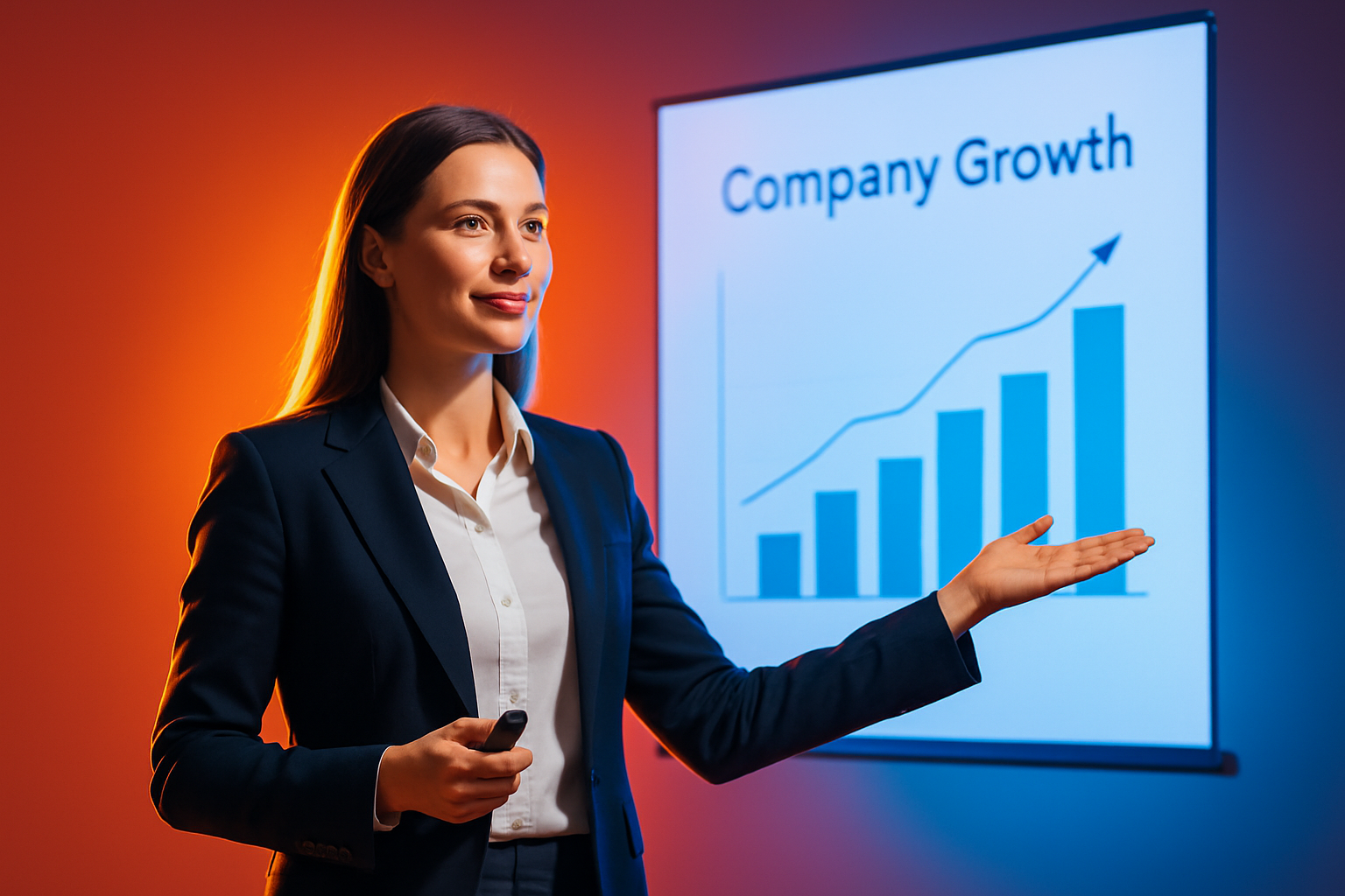 /Collection: /by davooda/Type: PNG/A confident businesswoman presents a graph showcasing company growth at a seminar. The vibrant background highlights her leadership and expertise in a professional setting.