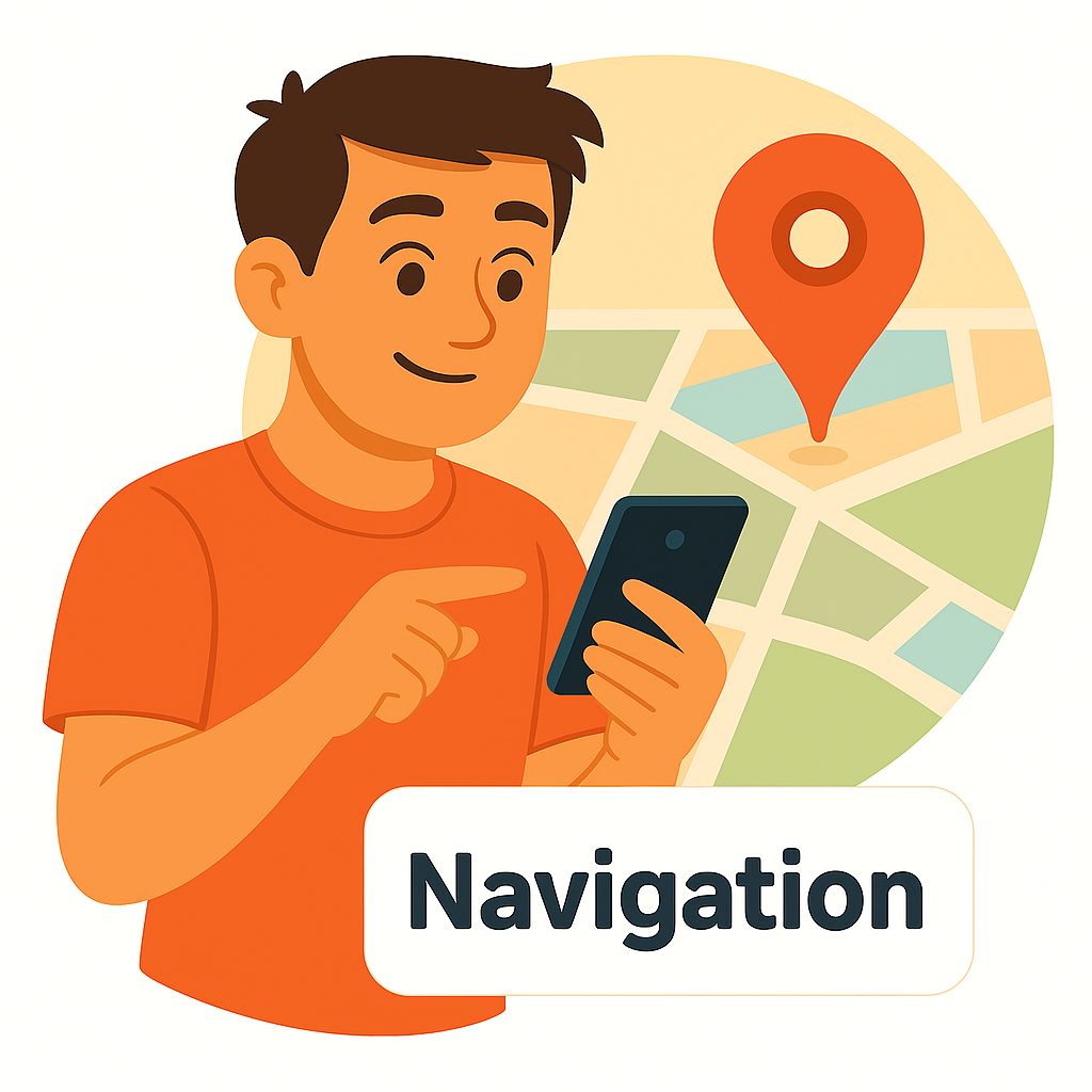 /Collection: /by davooda/Type: PNG/Colorful illustration depicting a person interacting with a smartphone for navigation, set against a map background. Ideal for tech or travel-related content.