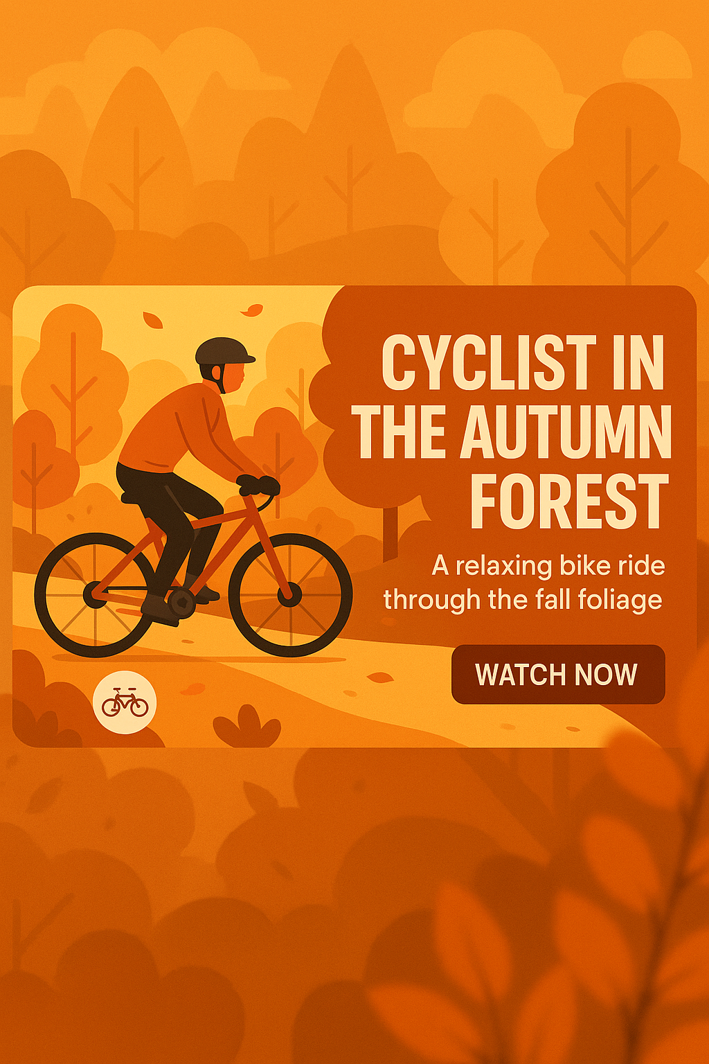 Vibrant promotional graphic featuring a cyclist riding through a colorful autumn forest. Ideal for outdoor activity campaigns or fall-themed content.