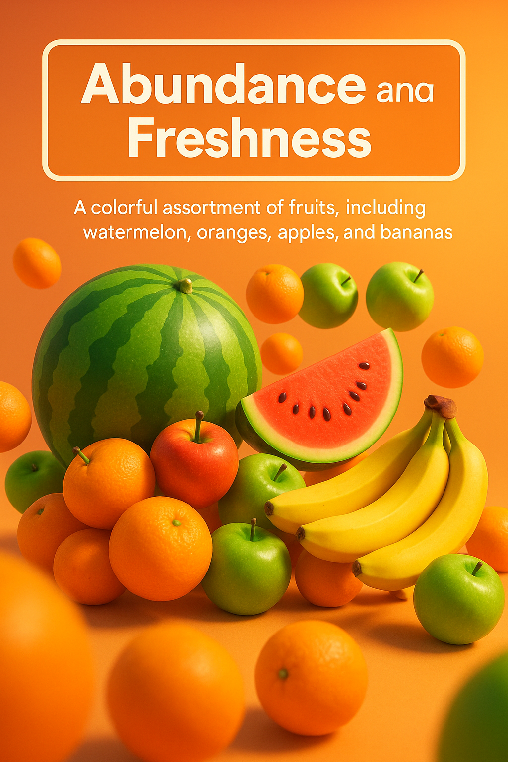 /Collection: /by davooda/Type: PNG/This colorful image features a variety of fruits like watermelon, oranges, and bananas, set against a bright orange background. Ideal for health and nutrition themes.