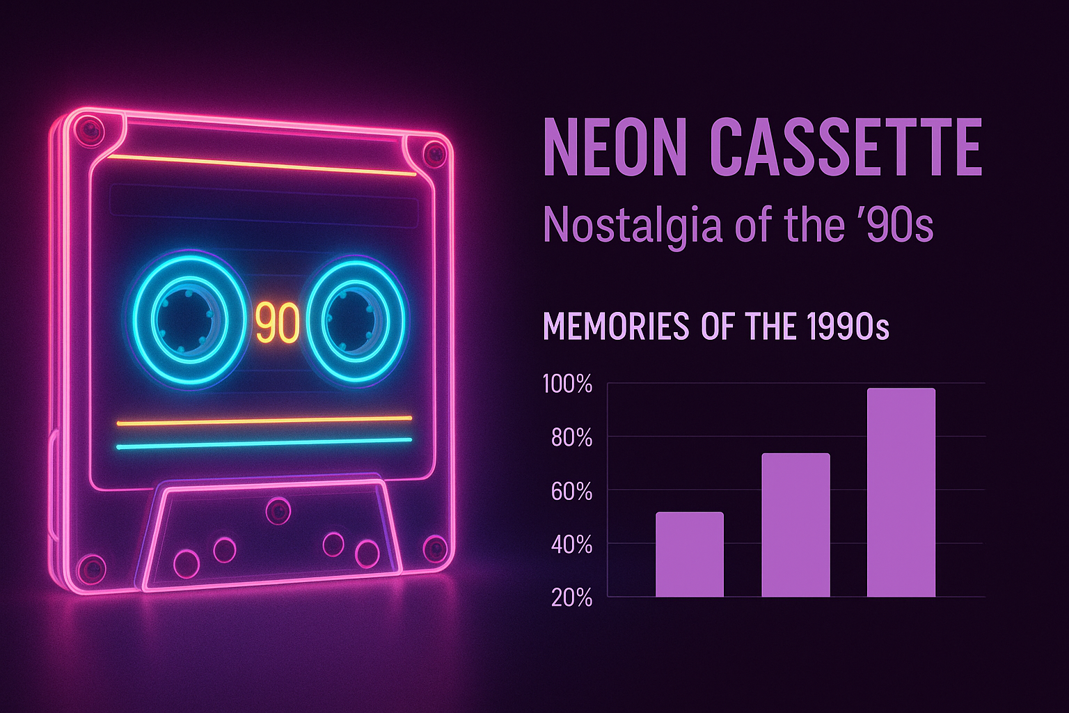 Vibrant neon graphic featuring a retro cassette tape and a bar graph, evoking nostalgia for the 1990s. Ideal for digital content related to retro music or pop culture.