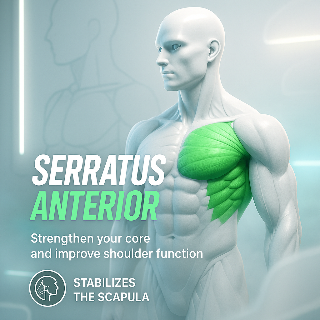 /Collection: /by davooda/Type: PNG/Detailed 3D anatomical illustration highlighting the serratus anterior muscle, designed for educational purposes in fitness and anatomy. The modern design features a stylized human figure with emphasized muscle groups.