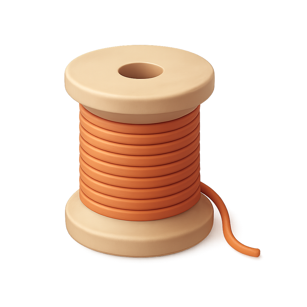 A visually striking 3D icon of a thread spool featuring a smooth, beige base and vibrant orange thread, presented in an isometric view with a transparent background.