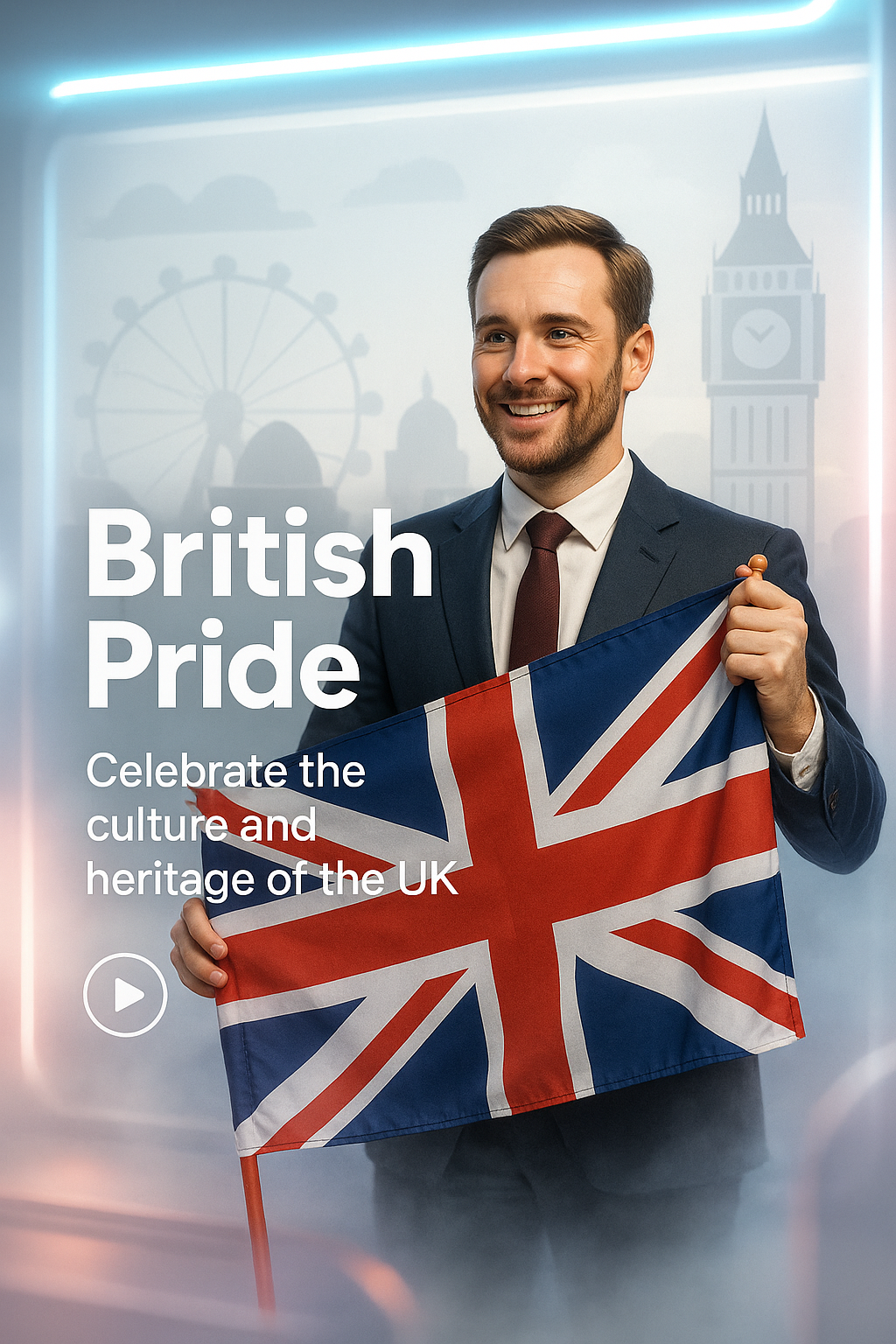 /Collection: /by davooda/Type: PNG/A vibrant promotional image featuring a man in a suit holding a Union Jack flag, designed to celebrate UK culture and heritage. Ideal for events or campaigns focused on British pride.
