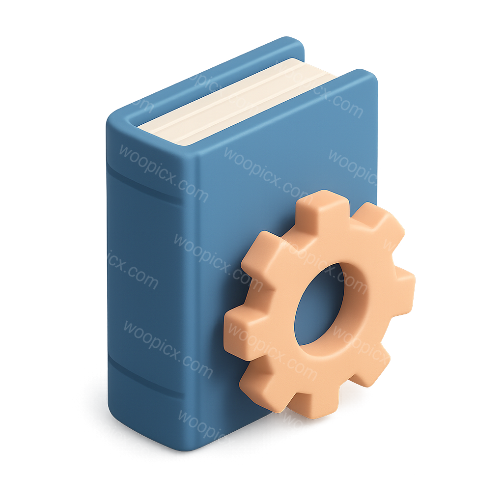 A stylized 3D icon of a book with a gear symbol, showcasing a three-quarter view and an isometric design, set against a subtle gradient background.