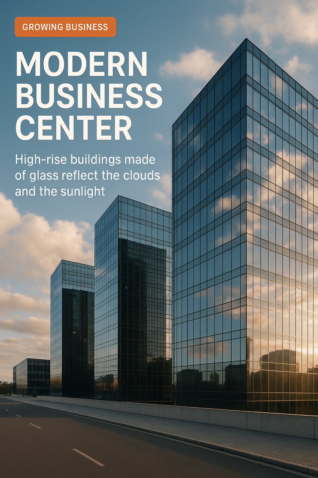 /Collection: , /by davooda/Type: PNG/A stunning image of a modern business center featuring high-rise buildings made of glass that reflect clouds and sunlight. The architectural design showcases contemporary style, ideal for corporate themes.