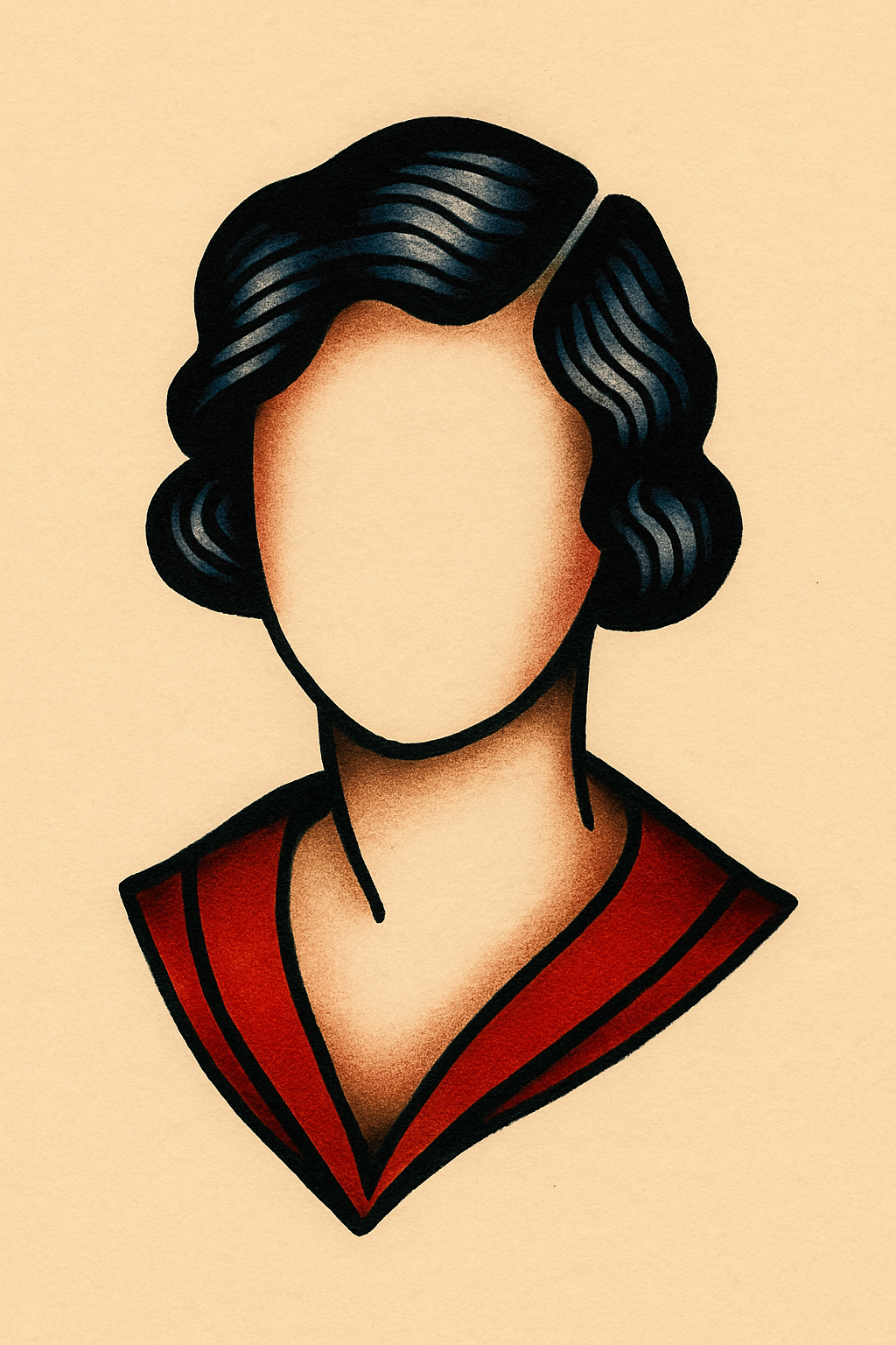 Illustrative Tattoo-Style Artwork Featuring a Crowned Female Figure