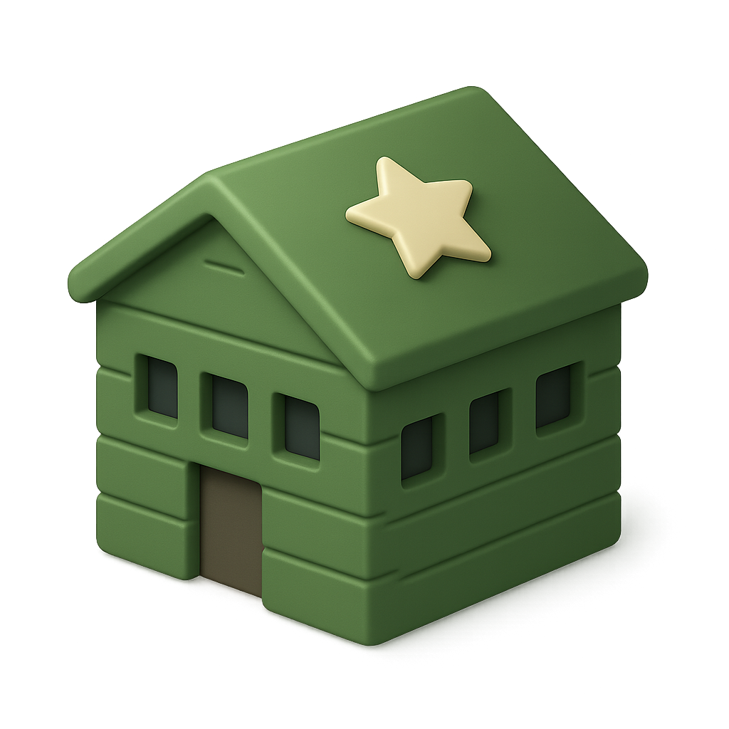 A 3D icon of a barracks building featuring a star emblem on the roof. The design is simple, with a green color scheme and a three-quarter isometric view, set against a soft background.