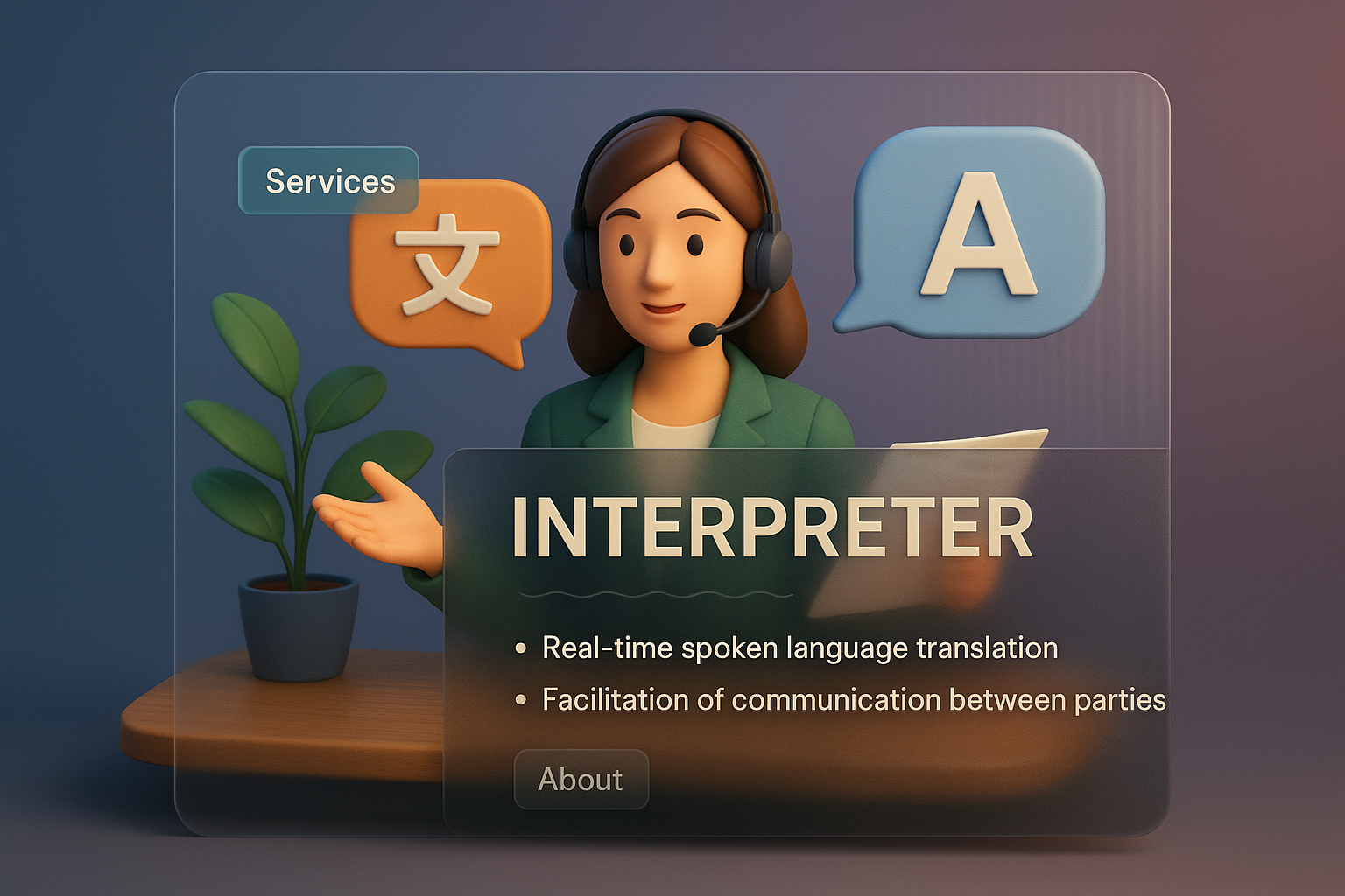 /Collection: /by davooda/Type: PNG/A visually rich 3D illustration of an interpreter with a headset, showcasing language translation services. The design features speech bubbles, a plant, and a stylish transparent panel.