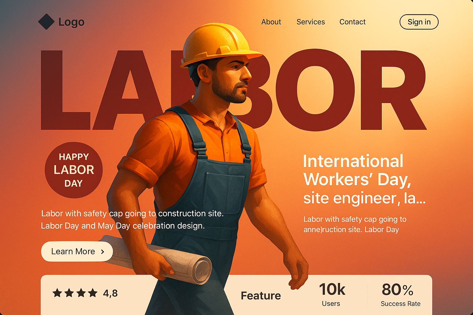 A vibrant landing page featuring a laborer in 3D graphics, celebrating Labor Day. The design includes a bold headline, action button, and informative blocks.