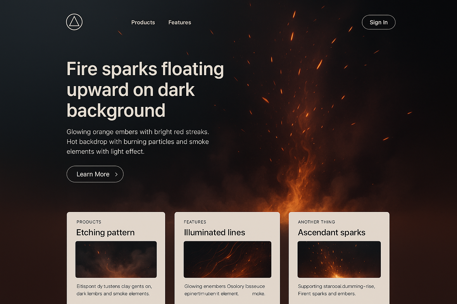 /Collection: /by davooda/Type: PNG/A visually striking landing page featuring glowing fire sparks and embers against a dark backdrop. The design includes sections for products and features with a clean, modern layout.