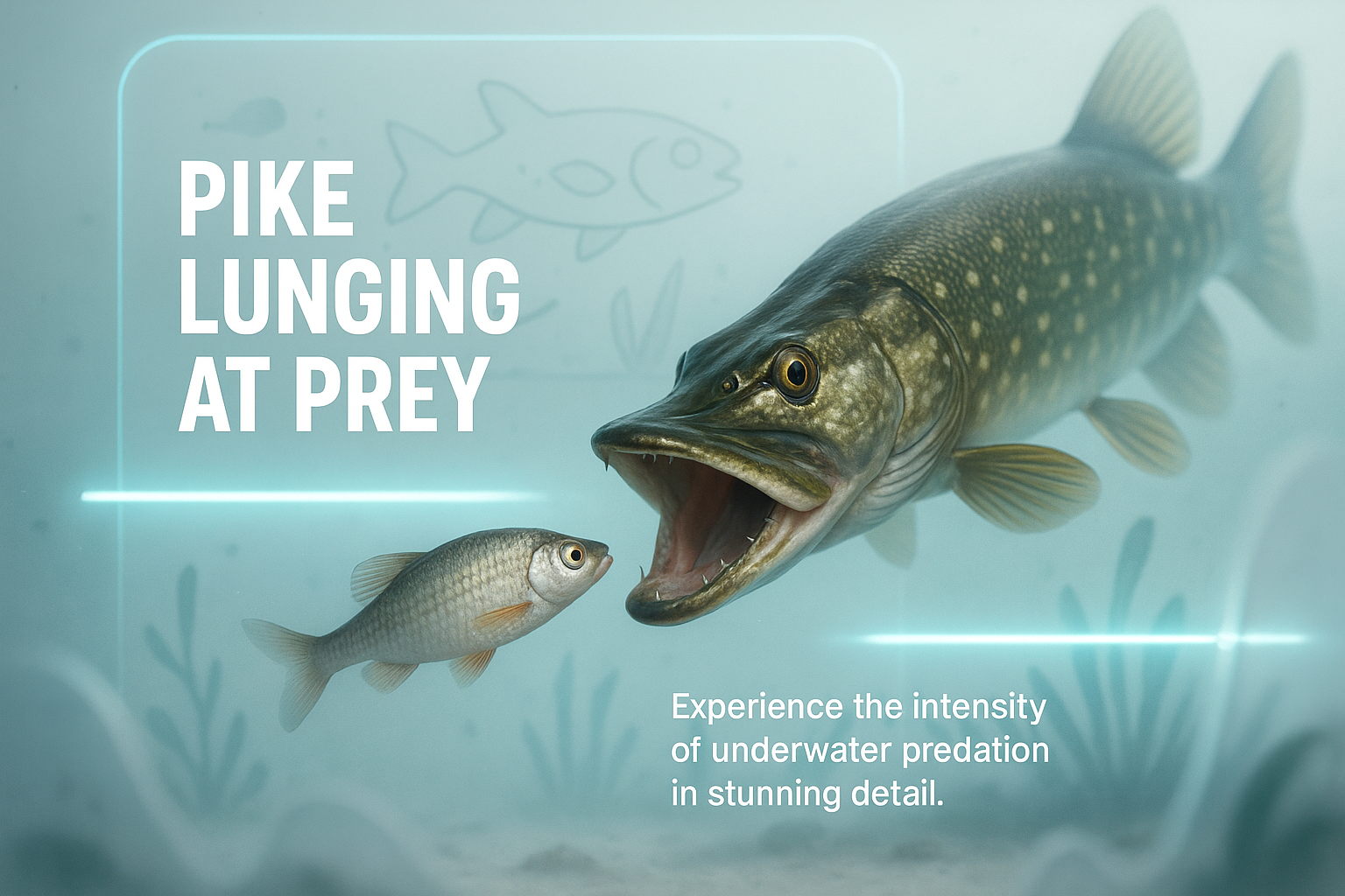 /Collection: /by davooda/Type: PNG/Dynamic underwater scene illustrating a pike lunging at its prey. The image combines realistic aquatic elements with a modern design, ideal for educational or promotional content about wildlife.