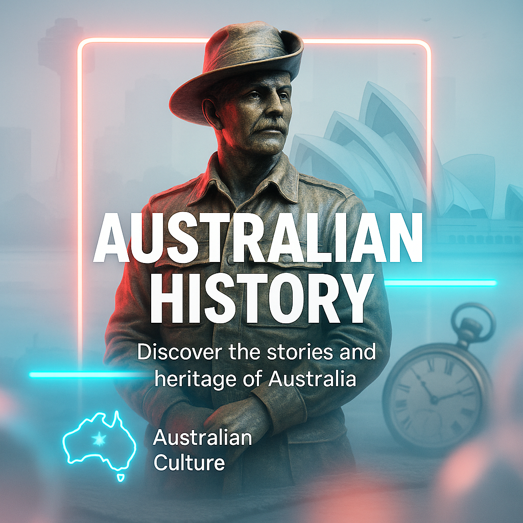 /Collection: /by davooda/Type: PNG/Engaging promotional graphic highlighting Australian history and culture, featuring a statue and iconic landmarks. Ideal for educational or cultural events.