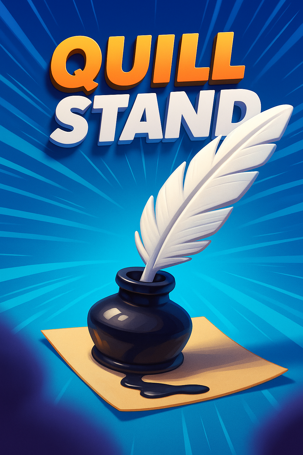 /Collection: /by davooda/Type: PNG/A vibrant illustration of a quill stand featuring a white feather quill and inkwell. The background showcases dynamic lines radiating from the center, enhancing the sense of motion.