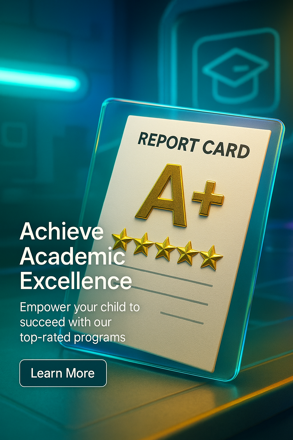 /Collection: /by davooda/Type: PNG/Engaging promotional image featuring a report card with an A+ grade, aimed at parents seeking educational programs for their children. The modern design appeals to a family-oriented audience.
